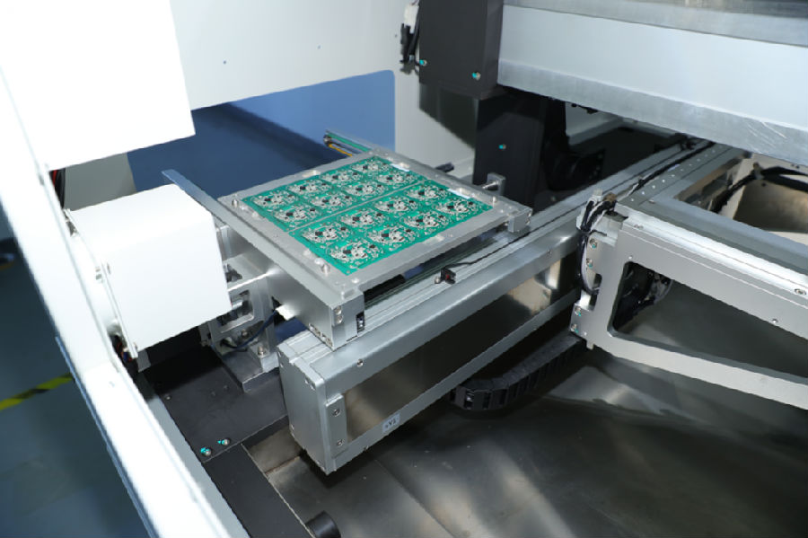 1. 将产品分板夹具夹紧并放置在加工平台分板上。加工完成后,夹紧并将分板夹具放置在放置轨道上,并进入下一个程序。
